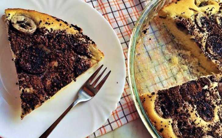 Formu jsem vymazala, vysypala kokosem a těsto do ní nalila. Na vrch jsem rozkrájela dva banány a posypala kakaem.
