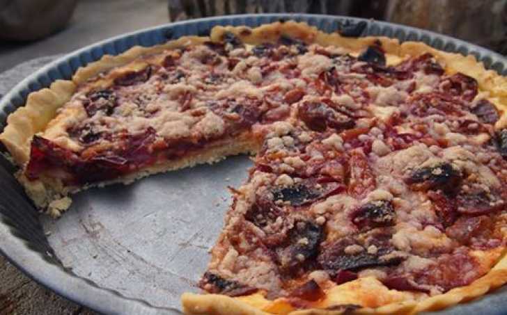 Mezitím si promícháme tvaroh s cukrem, který nalijeme na vychladlé těsto. Švestky promícháme se skořicí a naskládáme na tvarohovou vrstvu.