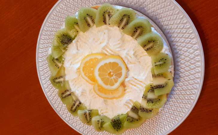 Na korpus natřeme krém, ozdobně uděláme vidličkou vroubky, lehce poprášíme kokosem a ozdobíme citronem, limetkou, kiwi - co máme a ladí do žluta.