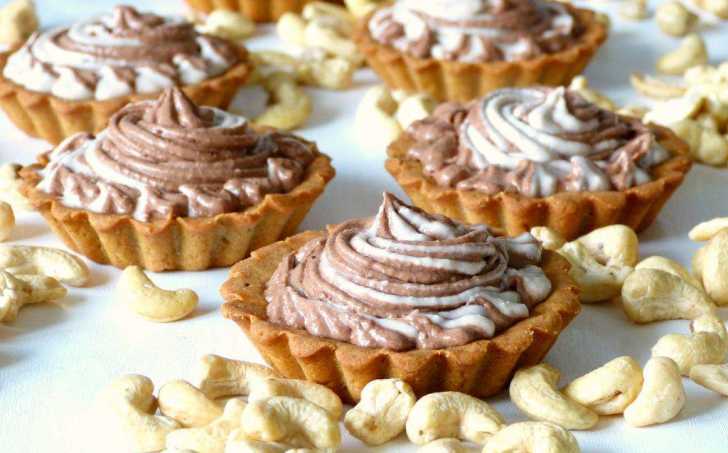 Rozmixujeme si na prach kešu ořechy a tyčovým mixérem vyšleháme banány, které jsme si pro snazší šlehání pokrájely. Rozmixované kešu ořechy a banány spojíme šleháním nebo pomocí tyčového mixéru, přidáme kokosovou smetanu. Kokosovou smetanu přidávejte podle konzistence krému, aby nebyl příliš řídký. Krém si následně rozdělíme na dvě poloviny. Do druhé poloviny všleháme kakao, naplníme si zdobící dvoukomorový sáček světlou a tmavou náplní a tartaletky krémem nazdobíme.