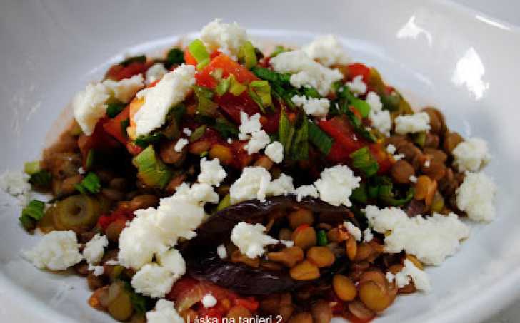 Keď už bola šošovica uvarená (al dente), začala som suroviny prekladať do zapekacej misy. Najprv baklažán, potom šošovicu, drvené paradajky, čerstvé paradajky, cibuľku. Prekladanie som zopakovala dvakrát a dala piecť do vyhriatej rúry na 180°C cca 30 minút.