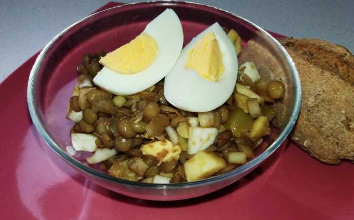 Mezitím si uvařte vejce natvrdo. Okurky a jablko pokrájejte na malé kousky, cibulku/pórek nadrobno. Vše pak přidejte k čočce. Zakápněte 1–2 lžícemi balzamikového krému, přidejte hořčici a osolte dle chuti.