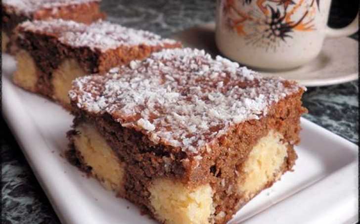 V kastrolku rozpustit máslo s čokoládou, důkladně promíchat a nechat vychladnout. V míse vyšlehat ručním elektrickým šlehačem celá vejce s cukrem, poté zašlehat zchladlou čokoládovou směs, vanilkovou esenci a mléko a nakonec vmíchat už jen vařečkou mouku s práškem do pečiva. Těsto nalít na velký plech (42x32cm), vymazaný máslem a vysypaný hrubou moukou, v pravidelných mírných rozestupech poklást kokosovými kuličkami a péct ve vyhřáté troubě cca 30 minut na 180 stupňů. Jěště horké zalít smetanou a posypat kokosem.
