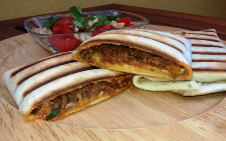 Směs nechejte vychladnout. Před grilováním naneste trochu směsi na střed tortilly. Na maso položte plátek oblíbeného sýru nebo sýr nastrouhejte. Při balení do taštičky nejprve přhněte dvě protilehlé strany ke středu a poté přes ně ohněte zbylé dvě strany.