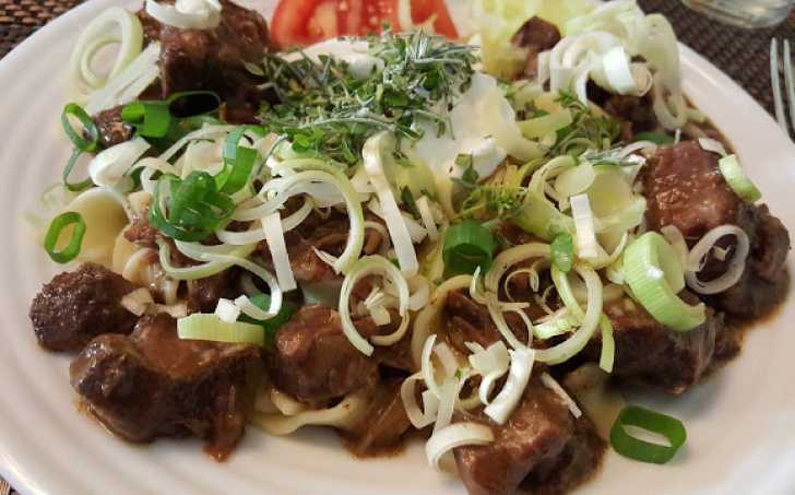 Nudle rozdělíme na talíře. Na nudle naservírujeme perkelt, navrch přidáme nízkotučný tvaroh, a nakonec posypeme nasekanými bylinkami a nakrájeným pórkem.