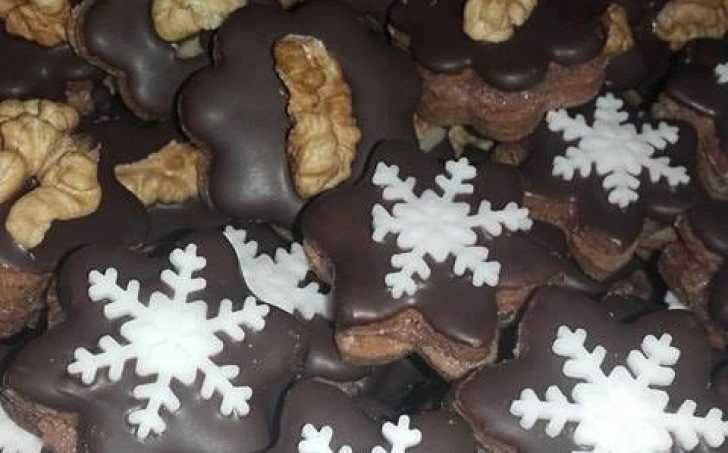 Suroviny na náplň smíchat, slepovat vždy 2 kusy k sobě, polít polevou a zdobit půlkou ořechu.
