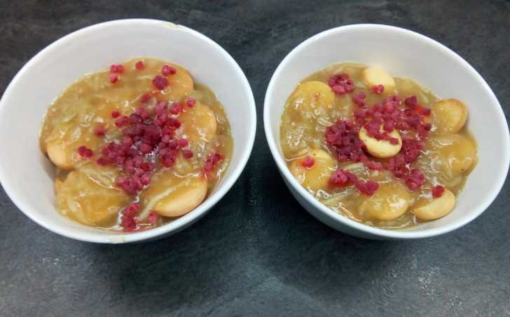 Část pudinku dáme do misky, přidáme pár piškotů na zasycení, zalijeme zbytkem pudinku.