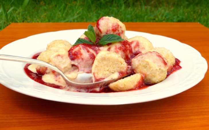 Jáhlové knedlíčky s ovesnými vločkami, jahodovým rozvarem a kešu vanilkovým krémem