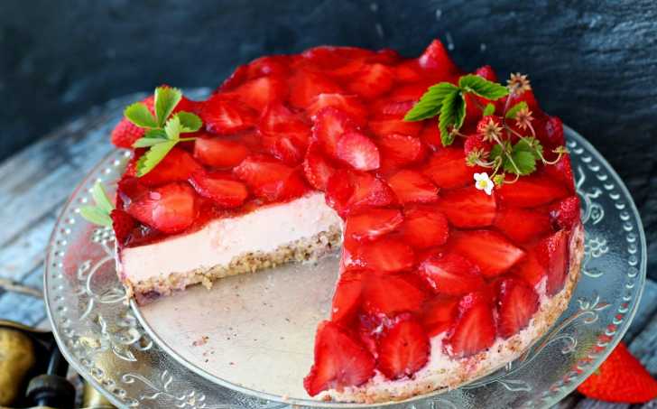 Formu s vychlazeným korpusem vymažeme po bocích troškou oleje a postupně vedle sebe skládáme řezem k olejované straně půlky jahod (mírně zatlačíme do korpusu). Opatrně doprostřed rovnoměrně rozetřeme mezi jahody jahodovou náplň a necháme cca 15 minut zamrazit. Nebo 2 hodiny zchladit v lednici až je povrch pevný.