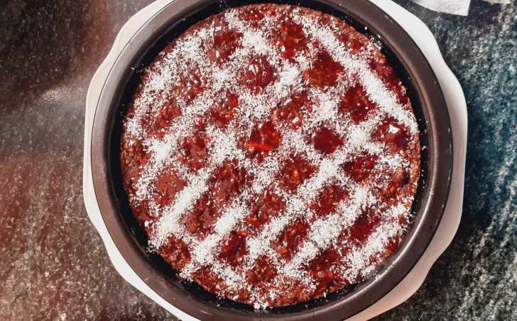 Hotový ještě teplý koláč jsem potřela LC marmeládou ( nebo si rozvař bobule s xylitolem) a posypala kokosem.