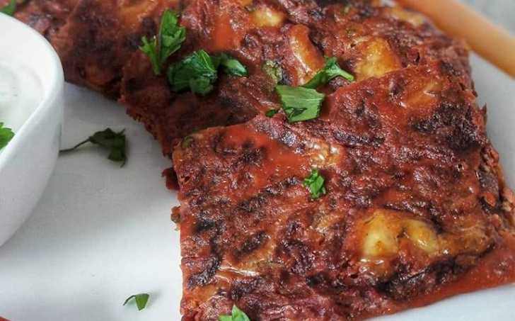 Předvařenou řepu jsem si nastrouhala na hrubém struhadle, sýr taktéž. Přidala jsem ostatní ingredience a snažila jsem se přebytečnou vodu alespoň trošku vymačkat. Udělala jsem na pečící papír placku a pekla jsem na 160°C 20 minut.