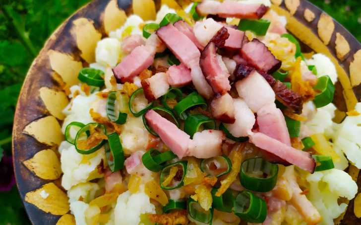 Na talíř nasypeme vařený květák a přidáme směs sýra a slaniny.