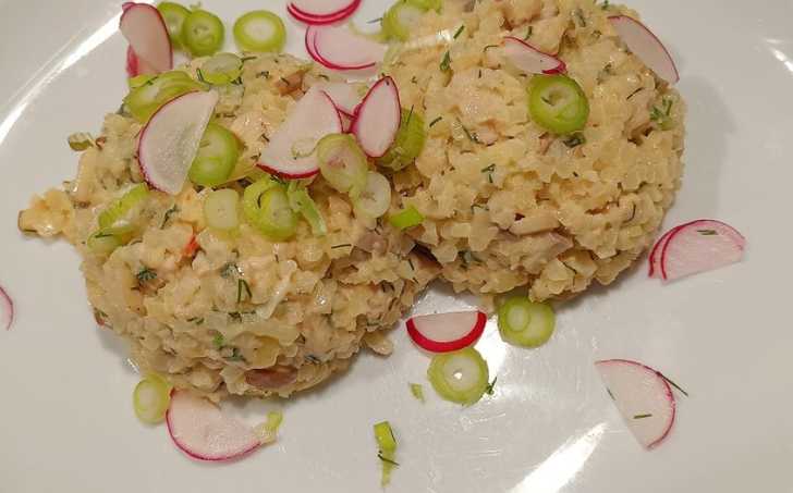 Přidat 3 hnědé žampiony nakrájené na menší kousky /záleží na vkusu každého/, orestovat, přidat květákovou rýži 400g, 100ml smetany a 100g strouhaného parmezánu. Míchat do zhoustnutí. Nakonec přidat čerstvý kopr nakrájený nadrobno. Promíchat a šmitec.