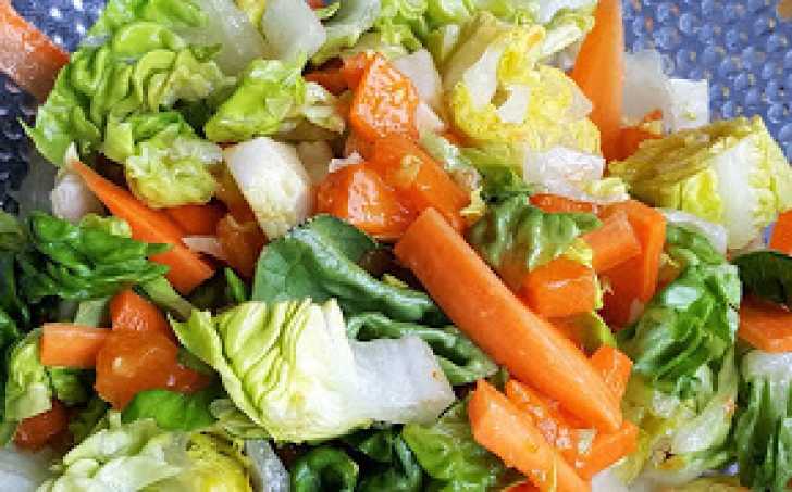 Salát a meruňky nakrájíme na kousky, mrkev na jemné nudličky.