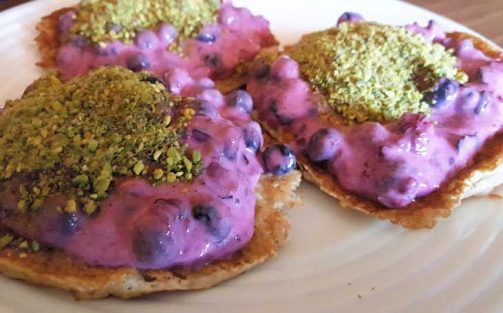 Lívance poskládáme na talíř, ozdobíme tvarohem a posypeme drcenými pistáciemi.