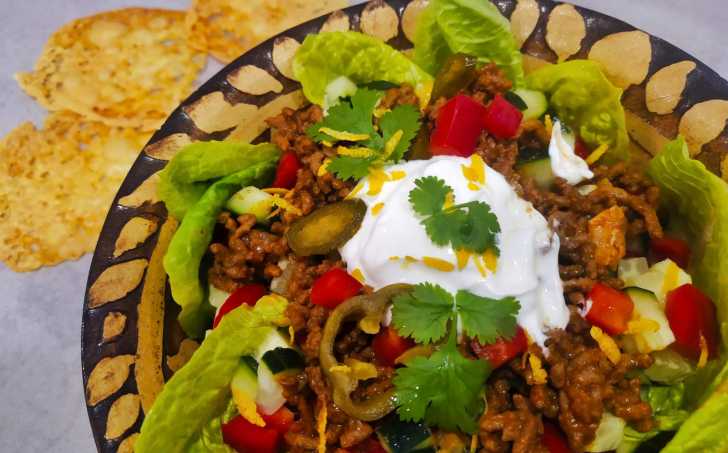 Rychlý, lehký a dobrý mexický low carb salát a sýrovými krekry. Pro strávníky bez restrikce sacharidů můžete krekry nahradit a doplnit pšeničnou tortillou.