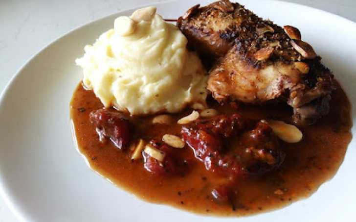 Pečená kuřecí stehna na rajčatech, oregánu a mandlích