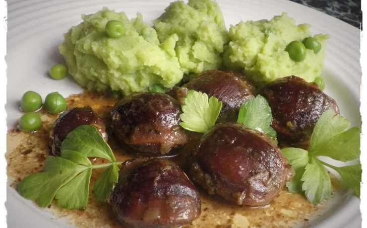 Žaludky důkladně očistíme a rozřízneme, vložíme do pekáče a přisypeme cibuli, česnek, koření a bylinky, mírně osolíme a zalijeme vývarem. Poté neprodyšně uzavřeme a pečeme doměkka v troubě na 180 stupňů asi 2 hodinky. Občas zkontrolujeme množství tekutiny a případně podlijeme vodou. Pak odklopíme, přidáme sádlo a dopečeme do barvy.