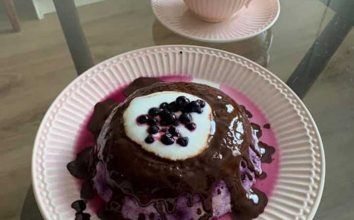 Hotový jsem vyklopila na talíř, polila 90% čoko rozpuštěnou s ghíčkem a ozdobila. POZOR!!! je to vařící, ale dobré :)