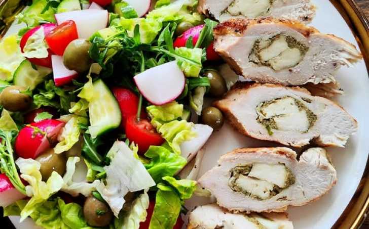Kuřecí prso nařízneme, naplníme pestem a sýrem. Osolíme, opepříme a opečeme na másle z obou stran dozlatova. Poté vložíme do trouby na 180 stupňů na 20 minut.