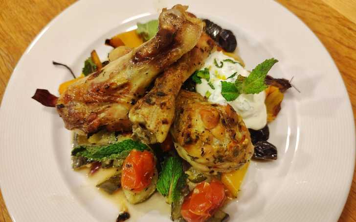 Předehřejte troubu na 220°C. V malé misce promíchejte olej, citronovou šťávu, utřený česnek, oregáno, tymián, dijonskou hořčici, sůl a pepř. Cuketu, papriku, červenou cibuli a rajčata nakrájejte na kousky. Kuřecí stehna a zeleninu obalte v marinádě a nechte marinovat 10 až 15 minut. Roztáhněte po plechu a pečte cca 30 minut. Pak přidejte olivy a pečte dalších 10 až 15 minut. Před podáváním posypte čerstvou, nadrobno nasekanou, petrželkou. Podávat můžete s jogurtovým dipem.