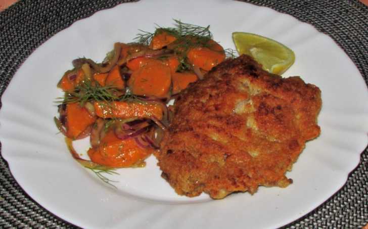 Maso je obalené ve směsi parmazánu, mandlové mouky a lahůdkového droždí a smažené na sádle.