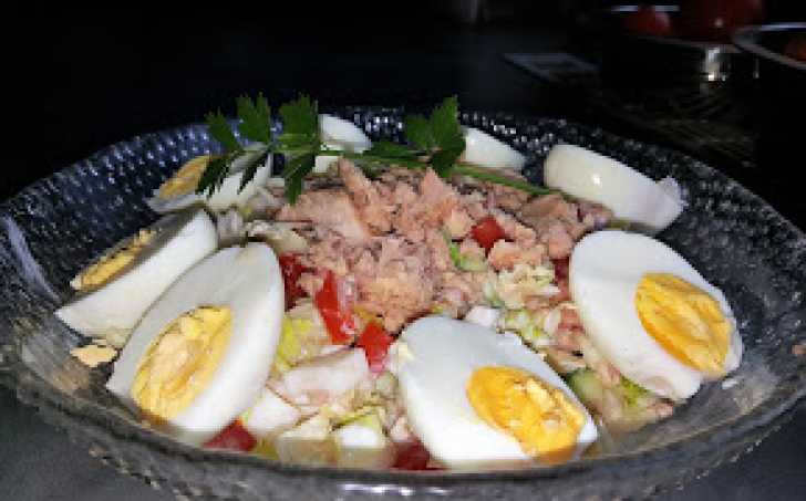 Na připravenou zeleninu přidáme navrch druhou polovinu tuňáka a vejce.