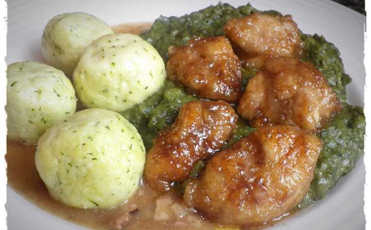"SKLENĚNÉ" KUŘECÍ MASO SE ŠPENÁTEM A BRAMBOROVO-CUKETOVÝMI KNEDLÍČKY