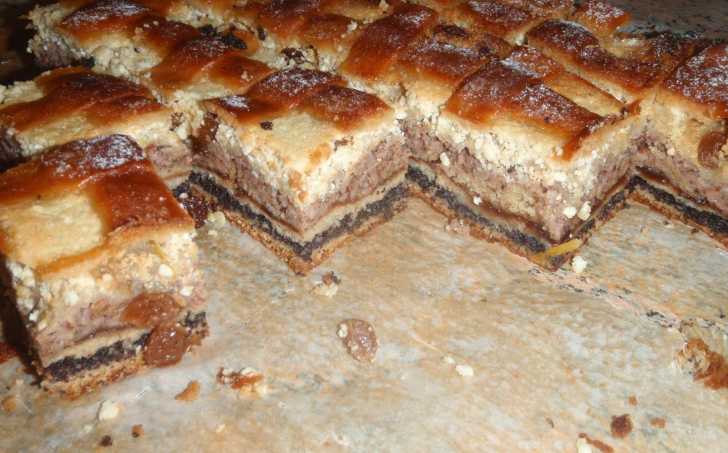 Po vykysnutí ho rozdelíme na 5 rovnakých bochníčkov, z ktorých na pomúčenej doske postupne vyvaľkáme 4 pláty. Na pomastený plech položíme prvý rozvaľkaný plát, na ktorý rozotrieme makovú plnku, prikryjeme ho druhým plátom, ktorý potrieme slivkovou plnkou, potom položíme tretí plát, na ktorý navrstvíme orechovú plnku a na štvrtý plát rozotrieme tvarohovú plnku.