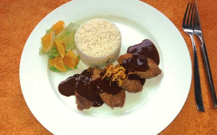 Do výpeku přilejte čerstvou pomerančovou šťávu a nechte chvíli povařit, aby se mírně zredukovala. Poté přidejte nahrubo nakrájenou čokoládu a na kousky nakrájený zázvor. Mírně osolte a pokud máte rádi ostré, přidejte špetičku chilli. Jakmile se čokoláda rozpustí, dobře promíchejte a je hotovo.