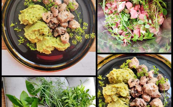 Maso očistíme od blan a tukové vrstvy, nakrájíme na kostky, osolíme a opepříme. Promícháme s bylinkami a dusíme doměkka (já v multifunkčním hrnci Salente Cuco, program dušení, hodinu).