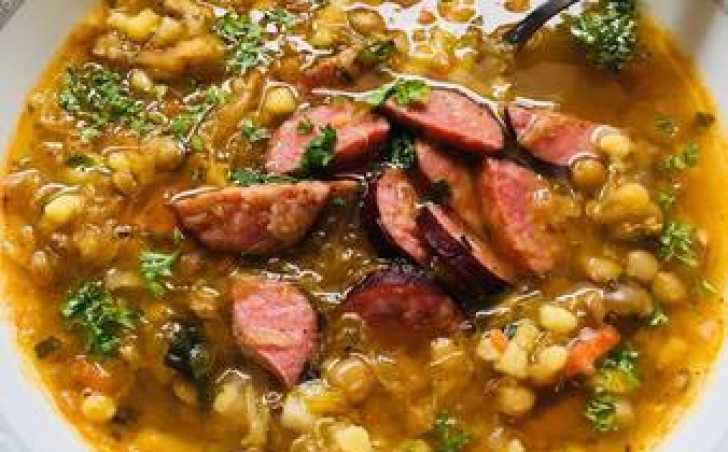 Pak přidáme nakrájenou klobásu, nastrouhanou kořenovou zeleninu, kysané zelí, nějaké drobení do polévky, prolisované dva stroužky česneku a jíšku. Jíšku uděláme z hladké mouky na troše oleje nebo sádla a jak je hotová, přidáme do ní mletou papriku, promíchneme a hned vypneme. To udělá polévce lepší chuť. ;) Není jí třeba moc, jen tak dvě lžíce na velký hrnec polévky. Vše spolu dobře provaříme a na závěr dochutíme majoránkou, případně ještě dosolíme.