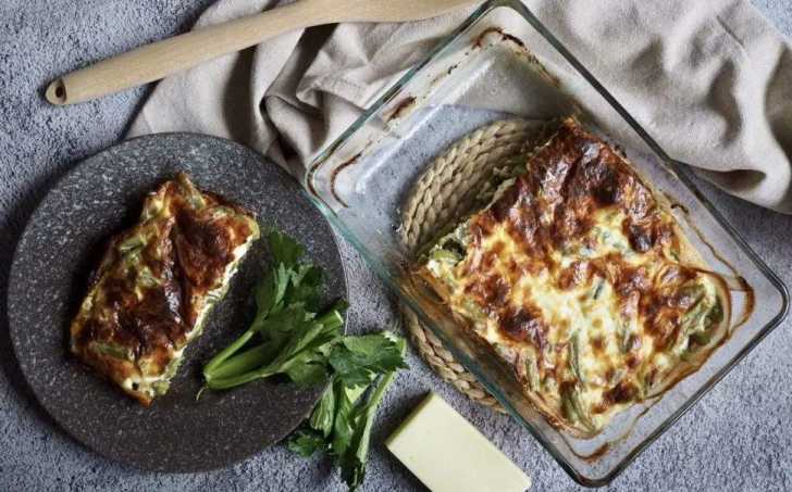 Zapneme si troubu na 180 stupňů. Zapékací misku 25x16 cm vyložíme slaninou, zbytek nakrájíme na kostičky. Fazolové lusky vložíme do osolené vroucí vody a necháme projít varem. Poté slijeme, necháme chvíli okapat a rozložíme do zapékací misky na slaninu a přidáme zbytek slaniny nakrájené na kostičky.