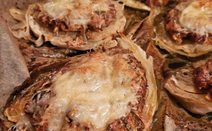 Pripravíme si mleté mäso: sol, mleté čierne korenie, cibulka najemno, pretlaceny cesnak, štipka mletej červenej papriky, provensálske bylinky, alebo môžete nahradiť majoránkou. Premiešame, vytvoríme v ruke gulky, ktoré sploštíme na hrubšiu placku a pokládáme na kapustu.