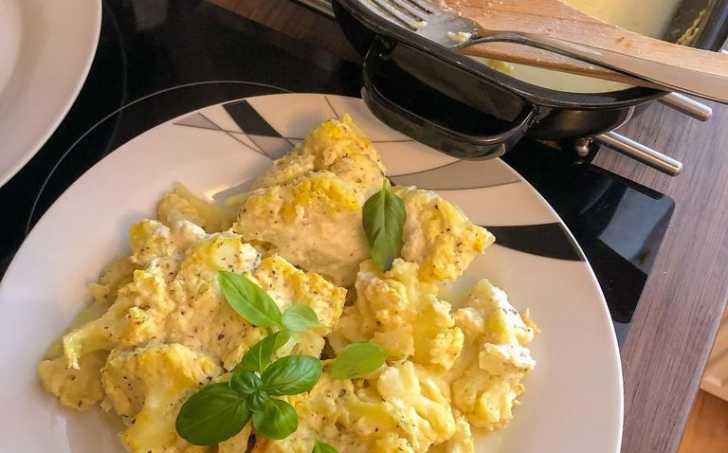 Květák uvaříte se lžičkou kari (pro barvu a šmrnc????????????) , scedíte, poté 1/4 květáku odeberete a rozmixujete společně se smetanou. Květák dáte na maso a zalijete smetanou.