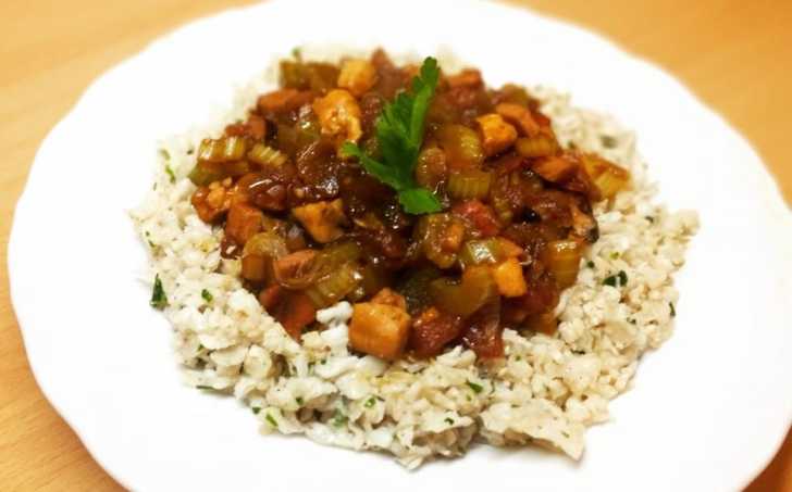 Paralelně si na druhé pánvi na kokosovém oleji na mírném plameni restujeme květákovou rýži. Když začne lehce zlátnout přidáme zbylé suroviny, ochutíme a na závěr vmícháme petrželku.