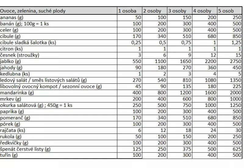Hodnoty odpovídají energetické potřebě průměrné ženy s menší fyzickou aktivitou a sedavým zaměstnáním. Denní příjem je průměrně 7000KJ.