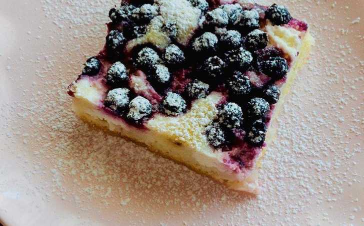 Tvaroh vymiešame spolu s cukrom s rozriedime ho s troškou mandlového mlieka. Zmes kladieme lyžicou na cesto vyliate na plechu a posypeme čučoriedkami alebo iným drobným ovocím.