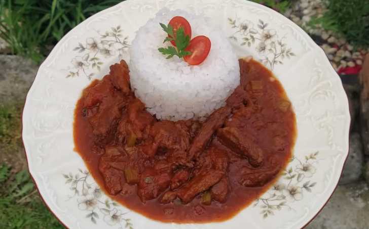 Když byla cibule osmažená, přilila jsem trochu vody a ještě nechala osmahnout. Pak jsem vložila do kastrolu orestované maso i s výpekem, přidala protlak a papriku. Promíchala jsem a nechala ještě trochu zarestovat. Přidala jsem sůl, pepř, česnek, adžiku a nakonec rajčata. Přilila jsem vodu a vše jsem opět důkladně promíchala. Můžete podlít i vývarem, ale osobně u takovýchto hutných pokrmů se silnou chutí preferuji vodu.