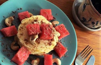 2 menšie banány rozmačkáme vidličkou na kašu, pridáme 2PL javorového sirupu, dreň z 1 vanilkového struku, 2 vajcia, 1čl škorice, štipku soli, 1čl bezfosfátového prášku do pečiva a všetko vymiešame ručným šľahačom do peny.