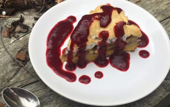 Hotový dort necháme úplně vychladnout. Podávat jej můžete přelitý domácím fermentovaným pyré z ostružin (vidíte na obrázku), které mu dodá lehce kyselkavou chuť.