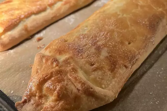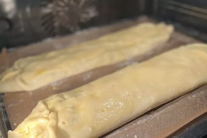 Vál posypeme moukou, těsto rozdělíme na dva stejné díly. Z těsta uděláme oválný bochníček a rozválíme. Pomocí válečku přeneseme na plech s pečícím papírem.