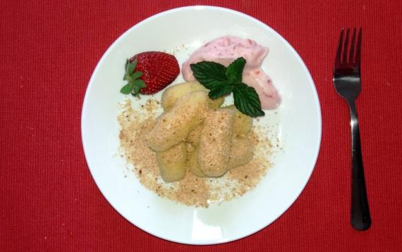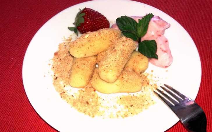 Uvařené šišky vatáhneme z vody, nandáme na talíř, posypeme perníkem a cukrem a polejeme máslem. Z pěny vytvarujeme nočky nebo ji jen tak lžičkou přidáme k šiškám a ozdobíme lístky máty a jahodou. Dobrou chuť.