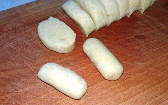 Uvařené a oloupané brambory nastrouháme na jemno. Přidáme mouku, krupici, vejce, sůl a škrob a vypracujeme vláčné pevné těsto. To vyválíme do delšího válečku, nakrájíme na kolečka a z každého kolečka vytvarujeme malý váleček.