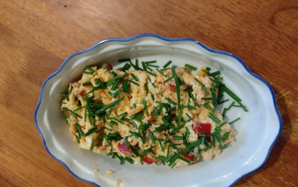 Nahrubo nastrouhám celer, mrkev, jablko, na kostičky nakrájený eidam, česnek, citronová šťáva přidat jogurt, nebo pomazánkové máslo, možné taky červená paprika na kostky. Posypat pazitkou.