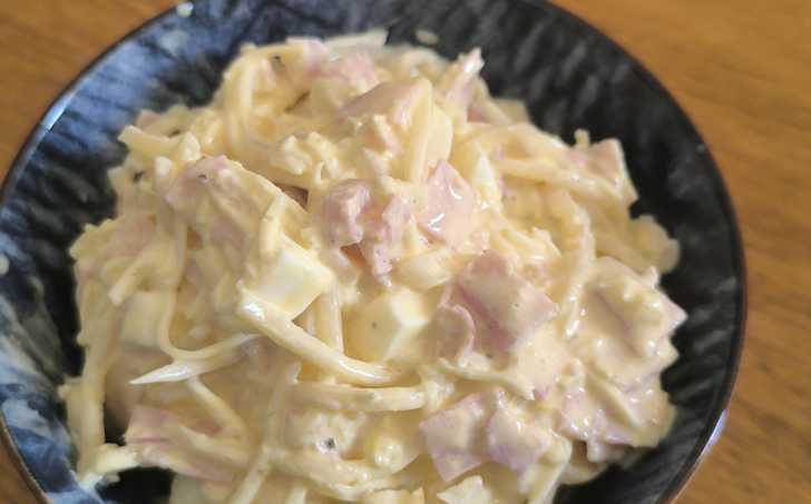 Nejprve si uvaříme vejce natvrdo, zchladíme a oloupeme je. Slijeme celer a kukuřici, necháme je vykapat na sítku. Cibulku, šunku a vejce nakrájíme na malé kousky. Vše smícháme, ochutíme soli a pepřem.