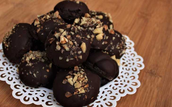 Na mírném ohni nechte v kastrůlku rozpustit se šlehačkou čokoládu, přidejte máslo a vymíchejte hladkou čokoládovou polevu. Polevou polévejte koláčky a sypte sekanými ořechy.