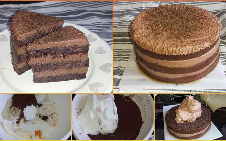 Ušlehat sníh. Smíchat vše ostatní, přidat sníh a nalít do formy (18 cm). Péct na 170 °C asi 30 min. Nechat vychladnout, rozřezat (nití) a naplnit krémem. Do lednice stuhnout