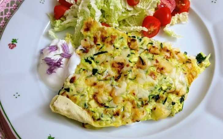 1. Cuketu nahrubo nastrouháme i se slupkou, osolíme a rukou promneme a chvíli počkáme až se uvolní tekutina. Dobře vymačkáme, přidáme na drobno nakrájený sýr , koření, vejce. Promícháme a vlijeme do koláčové formy vyložené pečícím papírem.