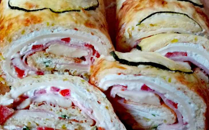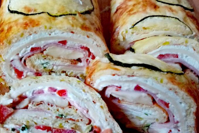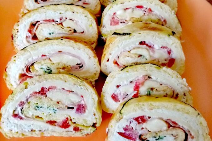 Nastrouhanou cuketu posolit a nechat vypotit, pak přes utěrku vymačkat přebytečnou vodu, smíchat se sýrem a vajíčkem trošku soli dle chuti a rozetřít na plech s pečícím papírem potřený trošku oliváčem. Poklást cuketou(kolečka) vedle sebe na těsto.Péct na 200 stupňů do zlatova,po upečení sundat z plechu, otočit aby kolečka cukety byla dole a sloupnout papír. Potřít náplní, na to šunku,plátkový sýr prostě tím kdo co má rád. Zarolovat +zabalit do fólie a dát do lednice aspoň do druhého dne.